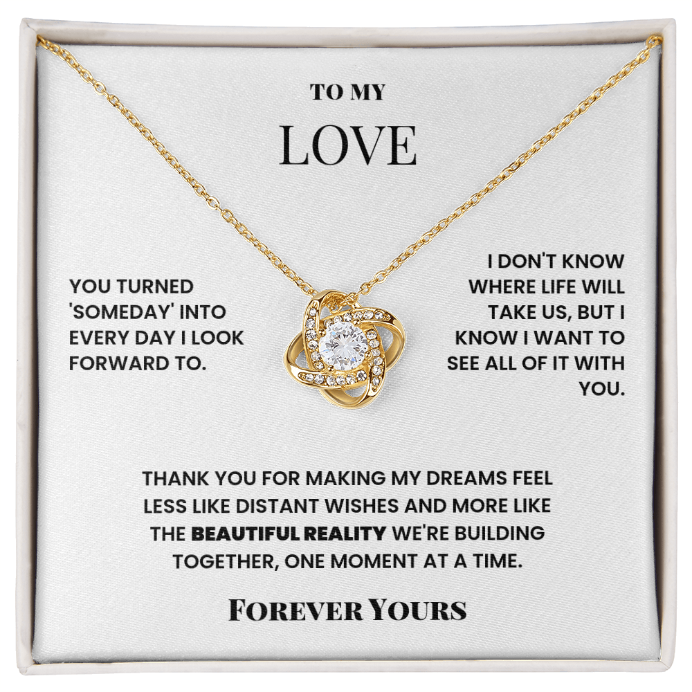 This “To My Love” Eternal Knot Necklace is made for the girl who turned your “someday” into every day you look forward to. The elegant knot pendant with a brilliant center stone represents the future you’re building together—one moment at a time.